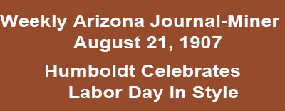The Phoenix band has been secured to provide music for the occasion, and all indications point to a thoroughly enjoyable time for all attendees. Large red and blue posters announcing the forthcoming celebrations have been printed and will be distributed throughout the northern part of the territory. Humboldt confidently expects to welcome the largest number of visitors in its history on Labor Day.